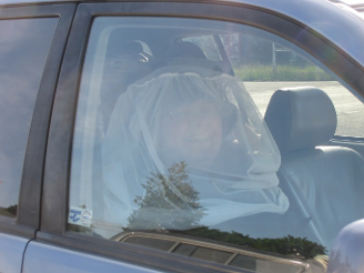 Above: Me wearing a shielded "bag" to protect my face from EMFs while traveling in the car.