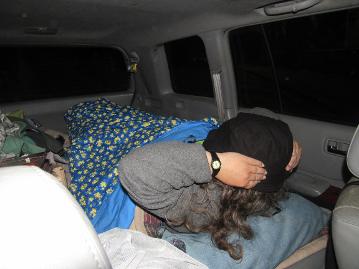Me getting ready to sleep in the car under my blue and yellow shielding-lined blanket.